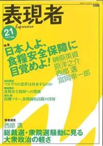 『表現者』 ◇ 偶数月16日発売(定価1,000円) 現在、第21号 特集:日本人よ、食糧安全保障に目覚めよ! 発売中 座談会 (榊原英資×原洋之介×西部邁×富岡幸一郎) 富岡幸一郎 「食」の問題は国防なり 榊原英資 食糧危機の時代 佐伯啓思 マルサスの悪夢は再来…