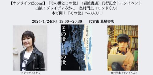 【オンライン】2024年1月24日(水)19:00~20:30 ブレイディみかこ・奥村門土(モンドくん)「本で開く「その世」への入り口」『その世とこの世』(岩波書店)刊行記念トークイベン ト 代官山 蔦屋書店 store.tsite.jp その世とこの世 作者:谷川 俊太郎,ブレイディ…