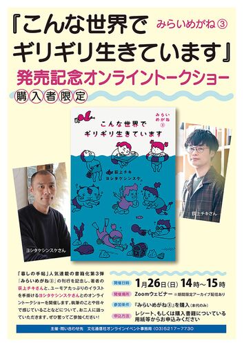【オンライン】2025年1月26日(日) 14時~15時 荻上チキさん×ヨシタケシンスケさん ※『こんな世界でギリギリ生きています みらいめがね(3)』を対象の書店でご購入された方 www.kurashi-no-techo.co.jp こんな世界でギリギリ生きています みらいめがね 作…
