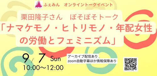 【オンライン】9月7日(日)10時~12時 栗田隆子さん ぼそぼそトーク 「ナマケモノ・ヒトリモノ・年配女性の労働とフェミニズム」 https://feminnamakemono.peatix.com/ 「働けない」をとことん考えてみた。 作者:栗田隆子 平凡社 Amazon ぼそぼそ声のフェミ…