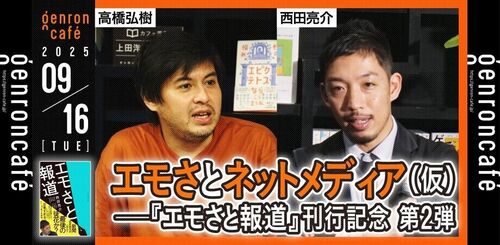 9/16(火)19:30 - 22:00 高橋弘樹×西田亮介 エモさとネットメディア(仮)──『エモさと報道』刊行記念第2弾 政治報道におけるRehacQ 以前とRehacQ以後、RehacQと他の動画メディアとの違い 五反田ゲンロンカフェ https://peatix.com/event/4566017/ エモさと…