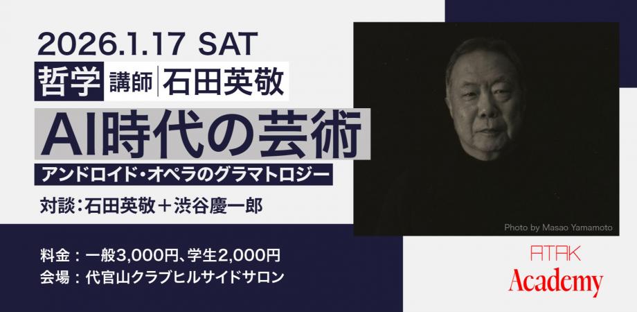 1月17日(土)14:30から 石田英敬+渋谷慶一郎「AI時代の芸術ーアンドロイド・オペラのグラマトロジー」一般3,000円、学生2,000円 代官山クラブヒルサイドサロン https://atak-academy-vol1-0117.peatix.com/event/4764509/view