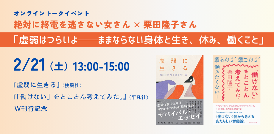 2026-01-30 「虚弱はつらいよ──ままならない身体と生き、休み、働くこと」 【オンライン】2/21 (土)13:00 - 15:00 絶対に終電を逃さない女さん×栗田隆子さん 「虚弱はつらいよ──ままならない身体と生き、休み、働くこと」https://kyojakuhatsuraiyo.peatix.com/ 虚弱に生きる (扶桑社BOOKS) 作者:絶対に終電を逃さない女 扶桑社 Amazon 「働けない」をとことん考えてみた。 作者:栗田隆子 平凡社 Amazon シティガール未満 作者:絶対に終電を逃さない女 柏書房 Amazon ぼそぼそ声のフェミニズム 増補新版 作者:栗田 隆子 作品社 Amazon 呻きから始まる 作者:栗田隆子 新教出版社 Amazon