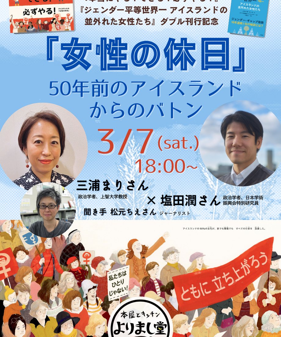 2026-01-31 ■ 3月7日(土)18:00〜19:30 三浦まり×塩田潤 司会:松元ちえ「女性の休日」50年前のアイスランドからのバトン『本当にやる!できる!必ずやる!』『ジェンダー平等世界一 アイスランドの並外れた女性たち』刊行記念本屋とキッチン よりまし堂(京王線南平駅)https://yorimashido.stores.jp/items/6970f032589ed6f994846283/ 本当にやる!できる!必ずやる!: アイスランドの女性の休日 作者:リンダ・オウラヴスドッティル,朱位昌併 ゆぎ書房 Amazon ジェンダー平等世界一 アイスランドの並外れた女性たち 作者:イライザ・リード 明石書店 Amazon