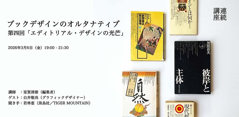 3月6日(金)19:00–21:30 白井敬尚 室賀清徳 聞き手・若林恵 第4回「エディトリアル・デザインの光芒」|連続講座:ブックデザインのオルタナティブ(全五回) 虎ノ門TIGER MOUNTAIN ギャラリースペース https://tm-lecture-bookdesign4-0306.peatix.com/event/4879349/view/