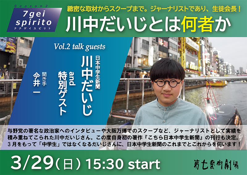 3月29日(日)15:30から 川中だいじ さん(日本中学生新聞)& 特別ゲスト 聞き手 今井 一 [7gei-spirito ナナゲイスピリト] Season2 第七藝術劇場(大阪市)https://www.nanagei.com/ev/ev_n260329.html