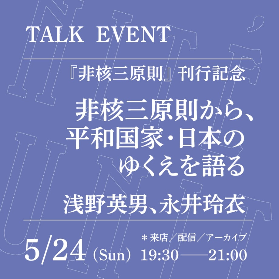 5/24(日)19:30-21:00「非核三原則から、平和国家・日本のゆくえを語る」(登壇者:浅野英男、永井玲衣)本と珈琲の店 UNITÉ(三鷹)https://unite-books.shop/items/69f144b99dd503b5ec16ead6